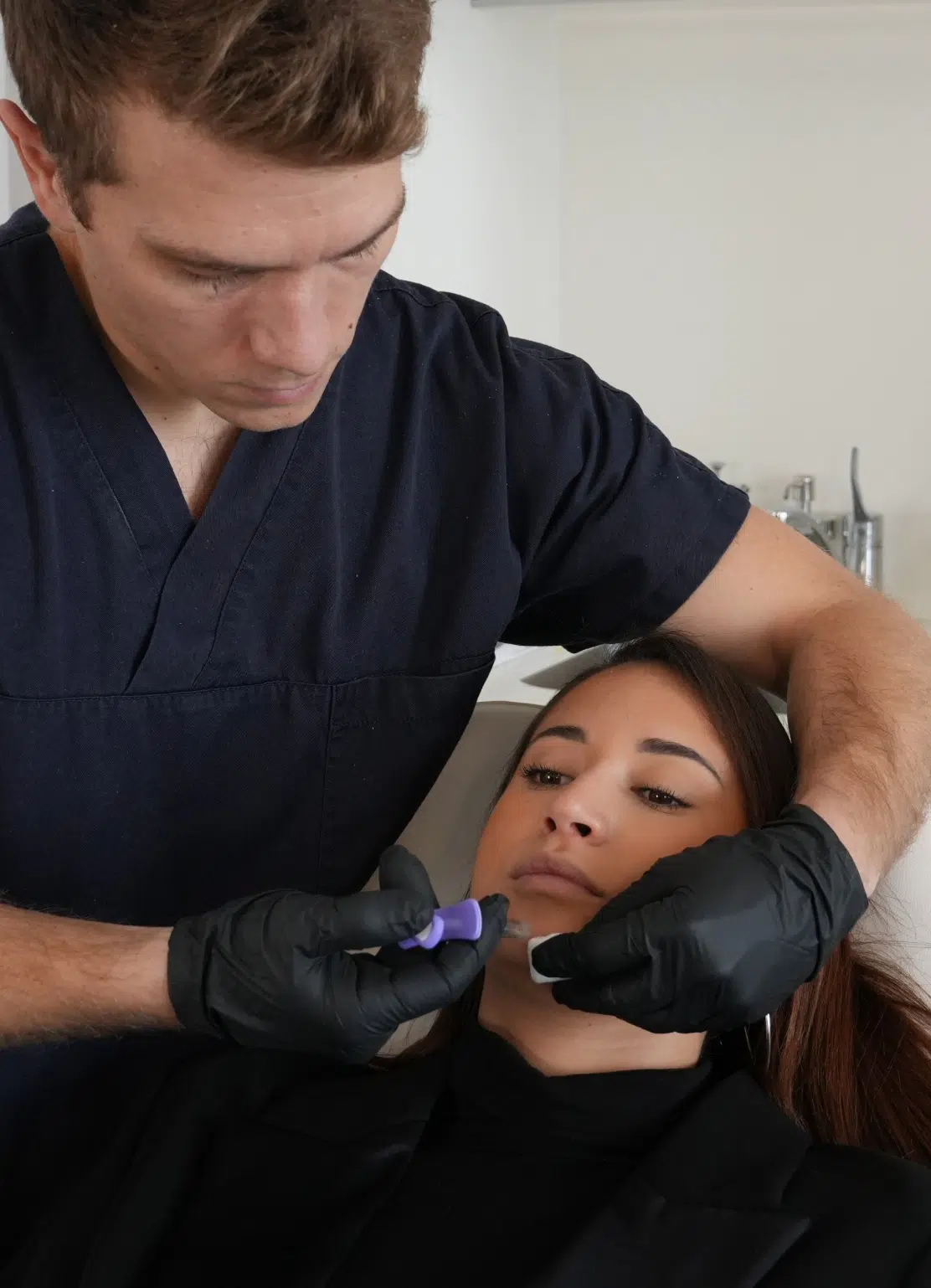 Le chirurgien maxillo-facial injecte avec précision l’acide hyaluronique selon le plan établi, remodelant la jawline et le menton de façon à harmoniser le visage.